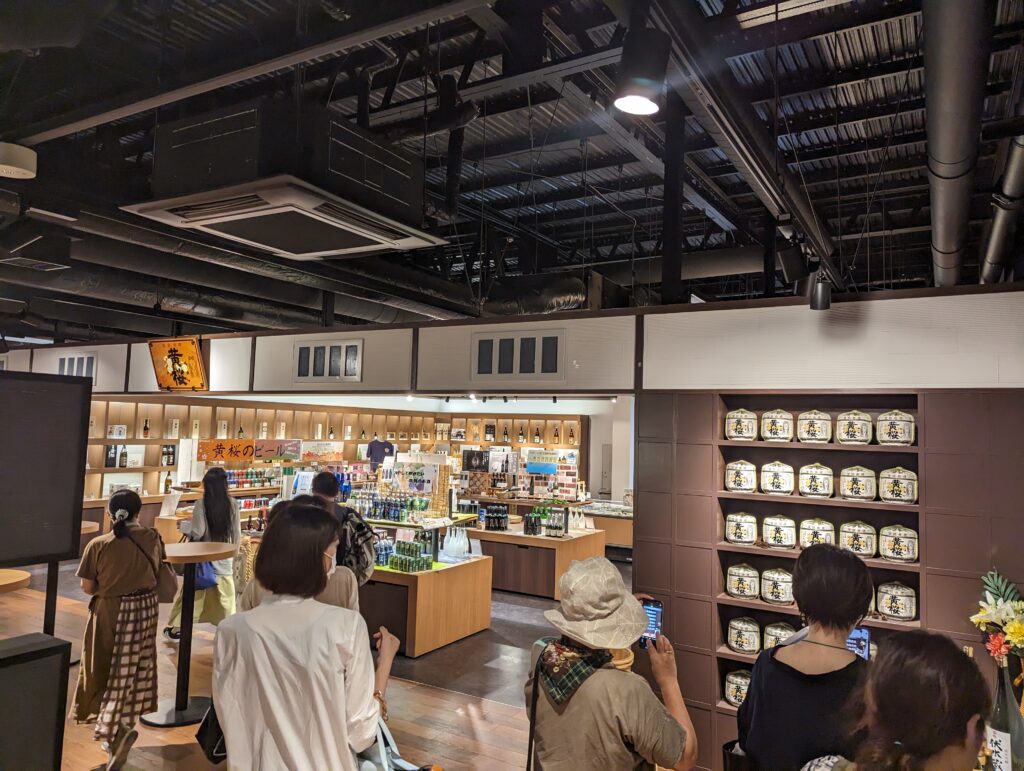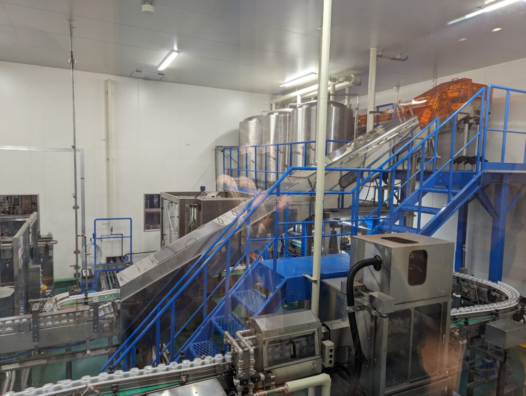 この建物は同社のグレードの高い日本酒とクラフトビールを主に製造しているそうで、見学専用通路は大きな開口部からガラス越しに工場がみられるようになっていました。